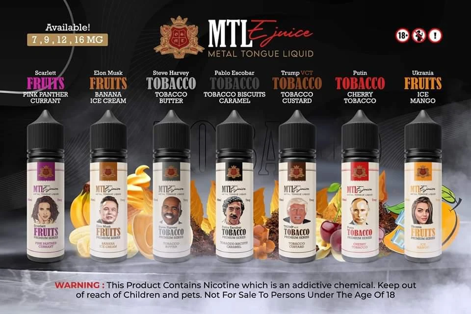| Flavor | Scarlet (Pink Panther Currant), Elon Mask (Banana Ice Cream), Steve Harvey (Tobacco Butter), Pablo Escobar (Tobacco Biscuits Caramel), Trump (Tobacco Custard Vanilla), Putin (Tobacco Cherry), Ukraine (Mango Ice), Hetler (Tobacco Caramel Nuts), Obama (Tobacco Caramel Dark), Megan Fox (Watermelon Ice) |